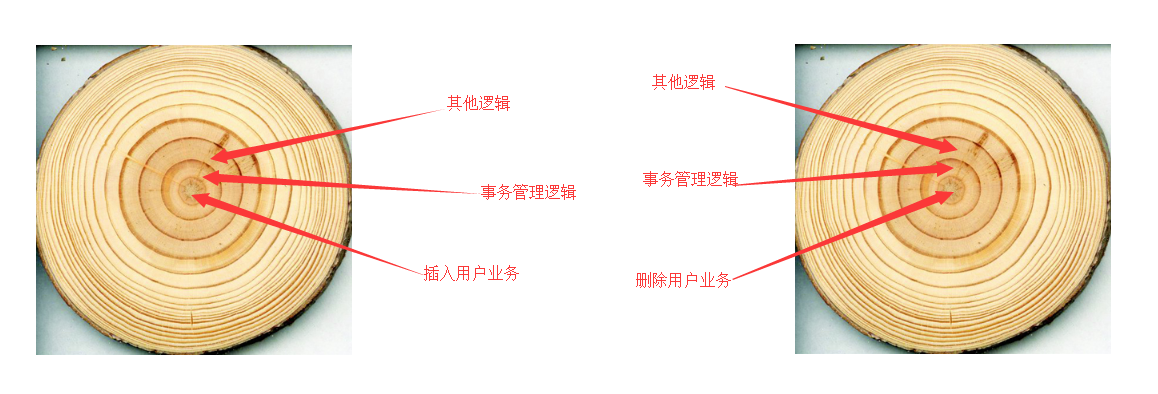 假设将上面的业务类看成一段实木,将类里的各种方法分别看成圆木的一截,会发现事务管理的代码像一个年轮,可能含有的其他逻辑(如访问控制)也像一个个年轮,而业务代码是圆木的树心,这也正是横切代码概念的由来。