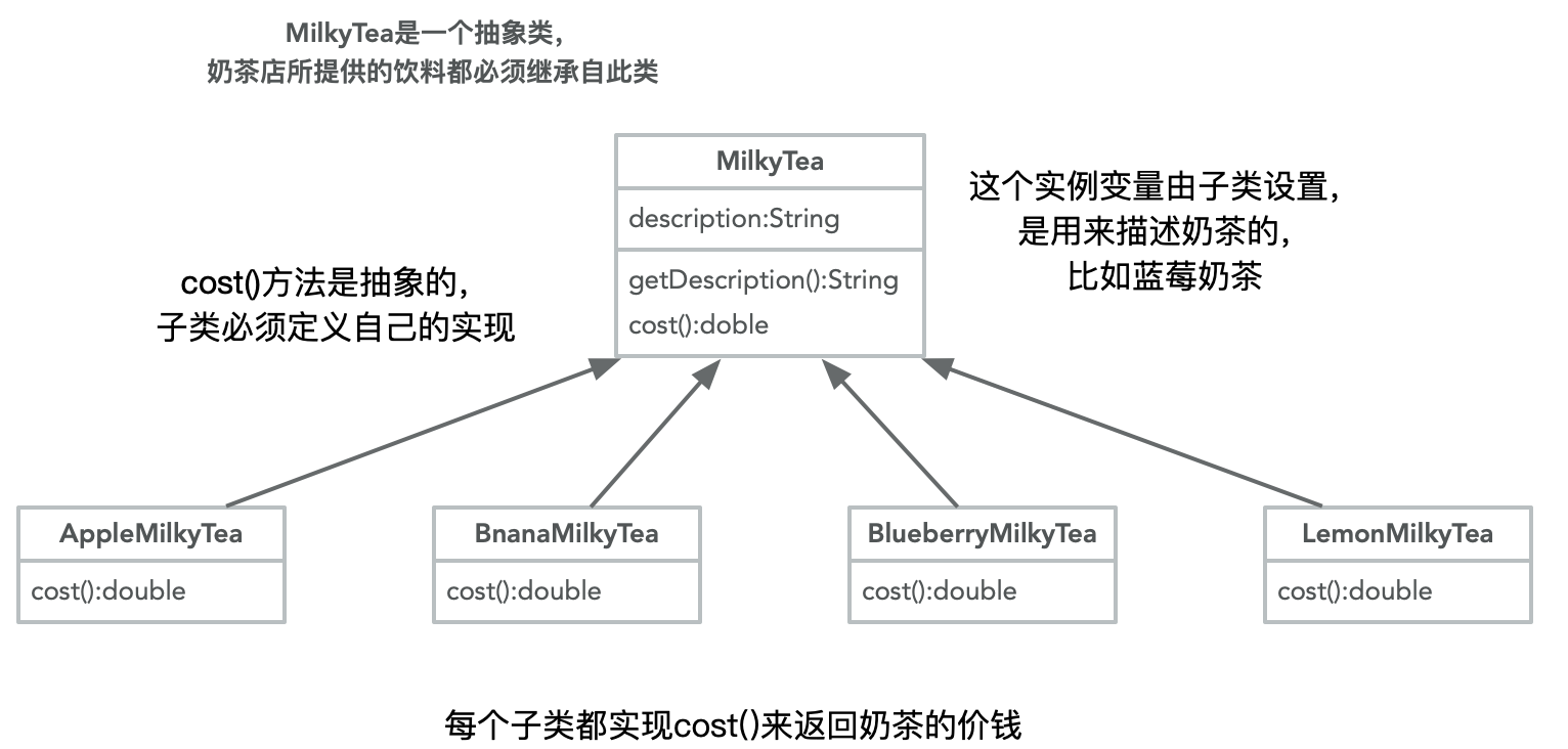 System.out.println(milkyTea.getDescription() + ",价钱人民币 " + milkyTea.cost() + " 块");