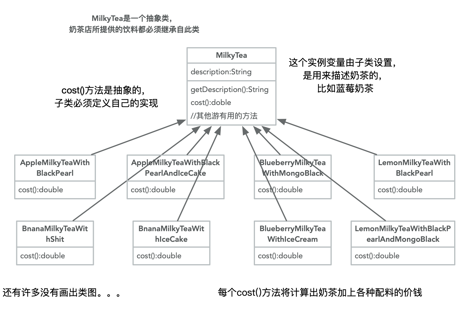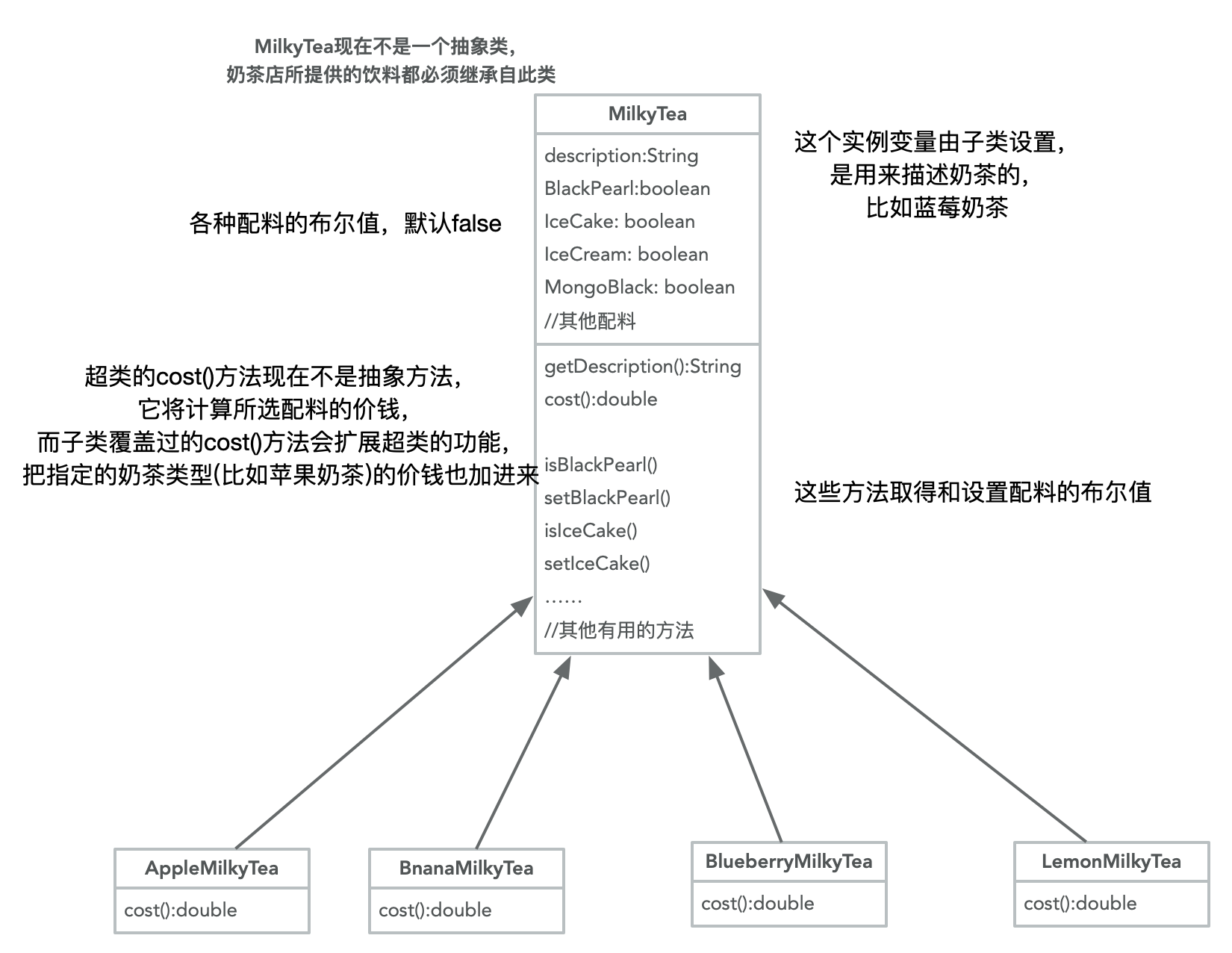 因此,我们重新改造一下,将MilkyTea基类加上实例变量,代表是否加上配料(黑珍珠、冰块、冰淇凌、芒果块等等):