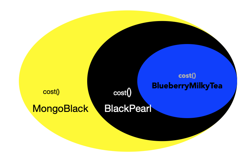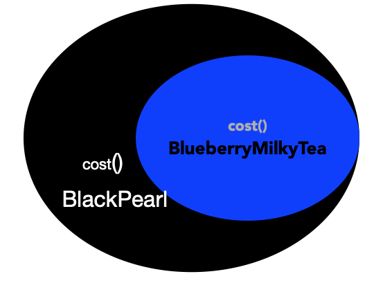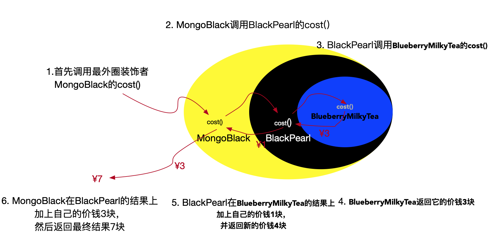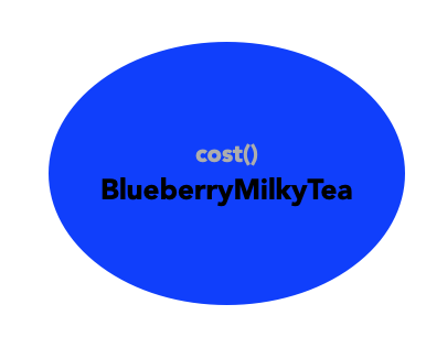 ① 以BlueberryMilkyTea对象为开始(蓝莓奶茶继承自奶茶,且有一个计算价钱的cost()方法):