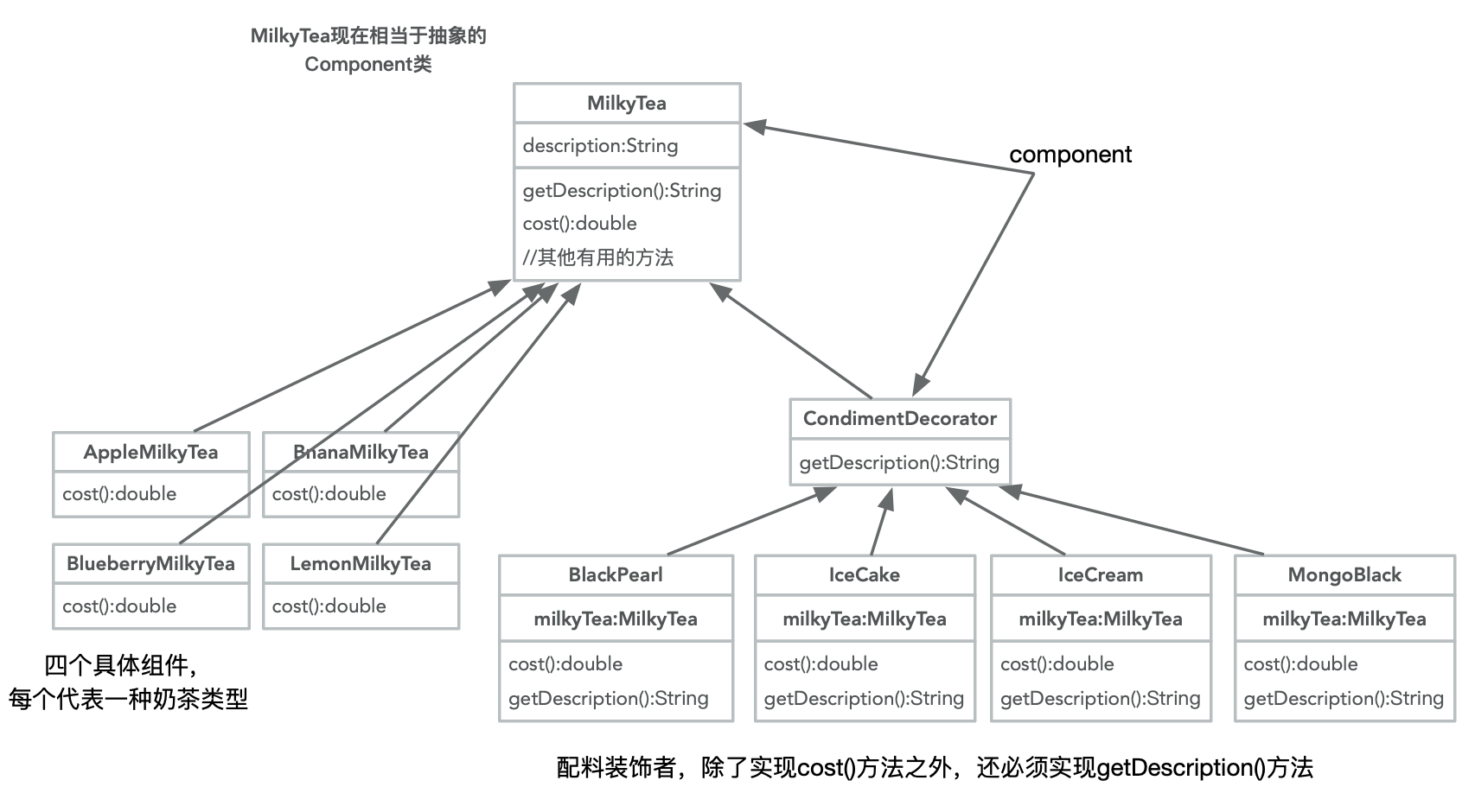 完成了抽象组件(MIlkyTea),有了具体组件(AppleMilkyTea、BlueberryMilkyTea),也有了装饰者(CondimentDecorator),紧接着就是实现具体装饰者配料类了,顾客说:往我的奶茶里加点黑珍珠和冰块。好嘞:1