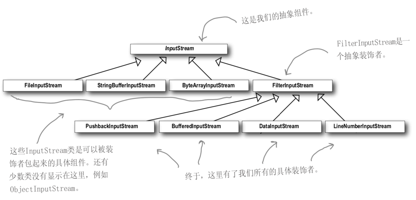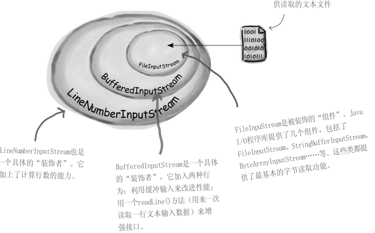 java.io类非常多,其中许多类都是装饰者。下面是一个典型的对象集合,用装饰者来将功能结合起来,以读取文件数据: