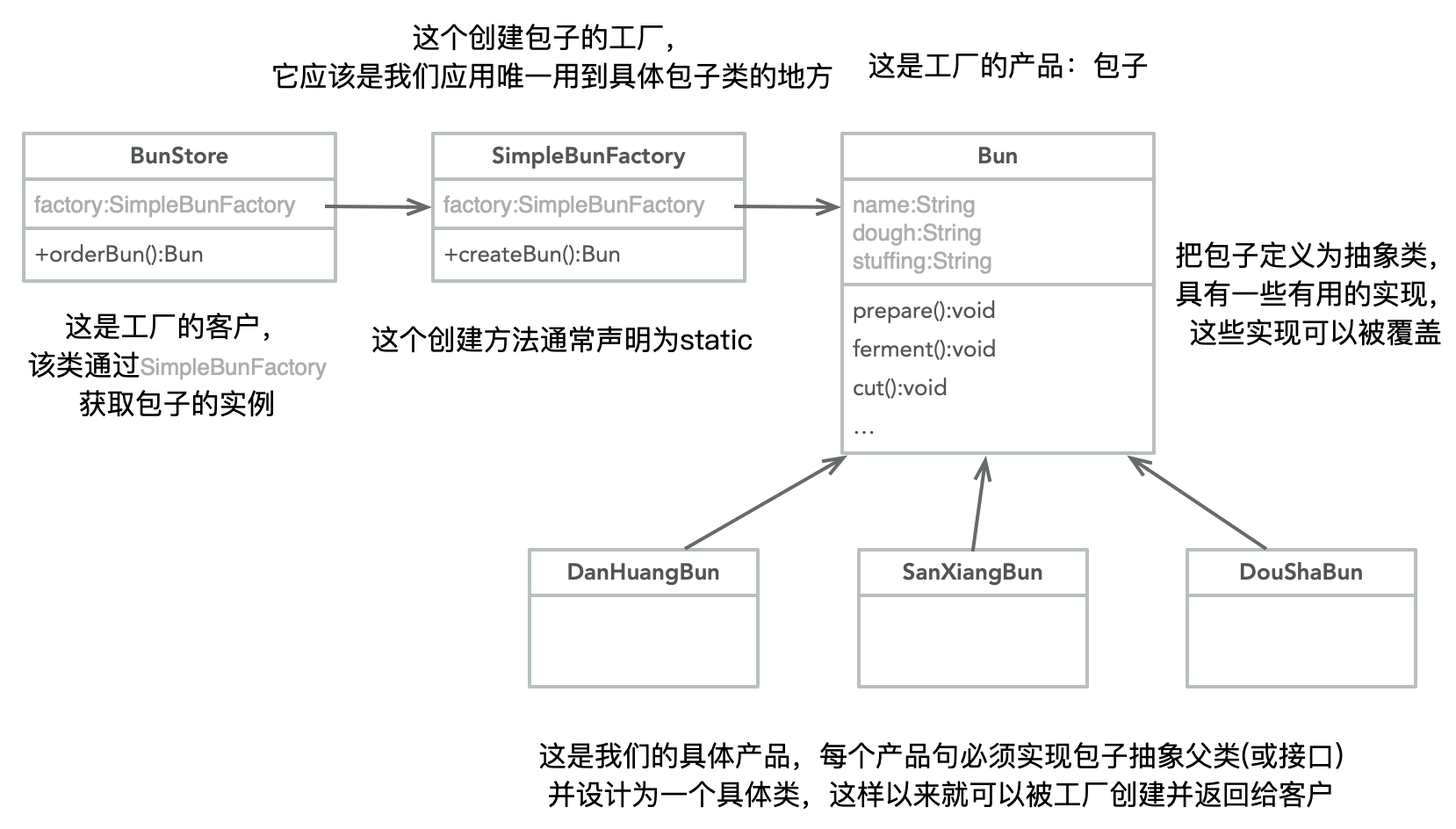 原本是由一个对象负责所有具体类的实例化,现在通过对BunStore类做的改变,变成由一堆子类来负责实例化。而且,现在实例化包子的子类被转移到createBun()方法中,此方法就如同一个工厂。