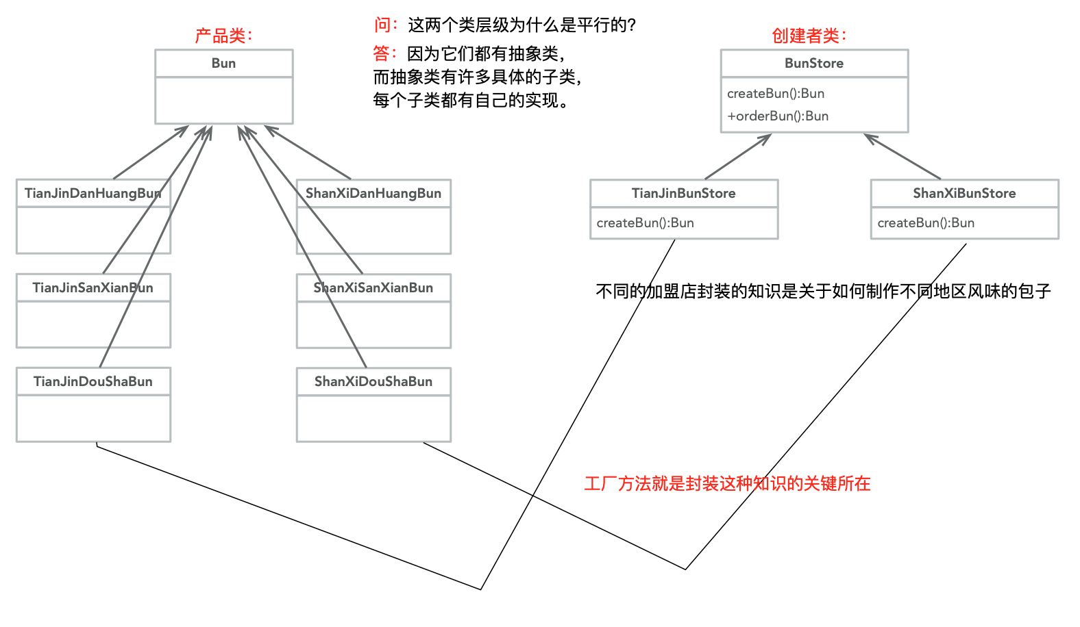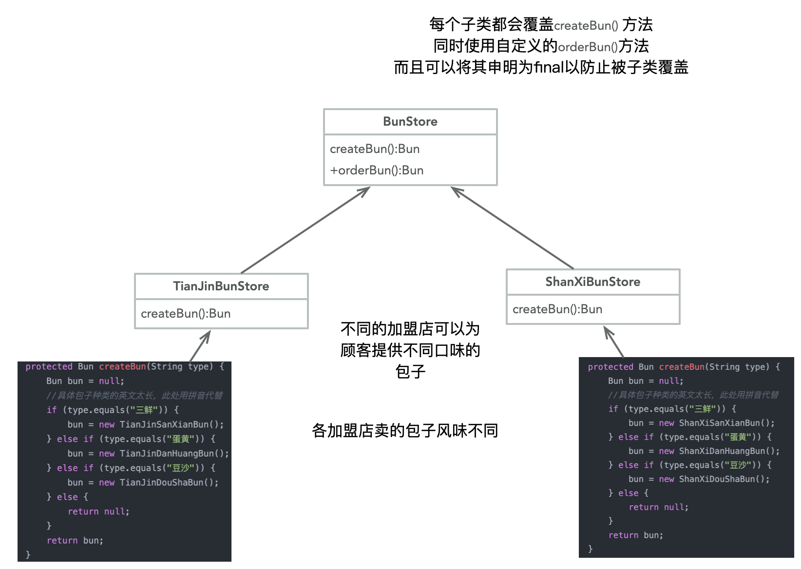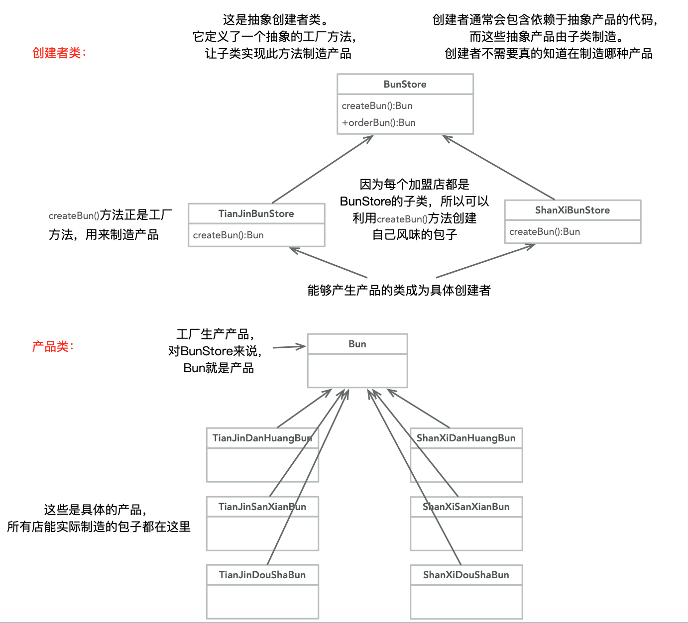 现在有了一个BunStore作为父类,让每个连锁店(天津包子铺,陕西包子铺)子类都继承自这个BunStore,每个子类各自决定如何制造包子,让我们看看现在的类图: