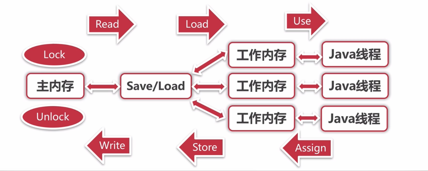 - Write(写入):作用于主内存的变量,把 Store 操作从工作内存中一个变量的值传递到主内存的变量中